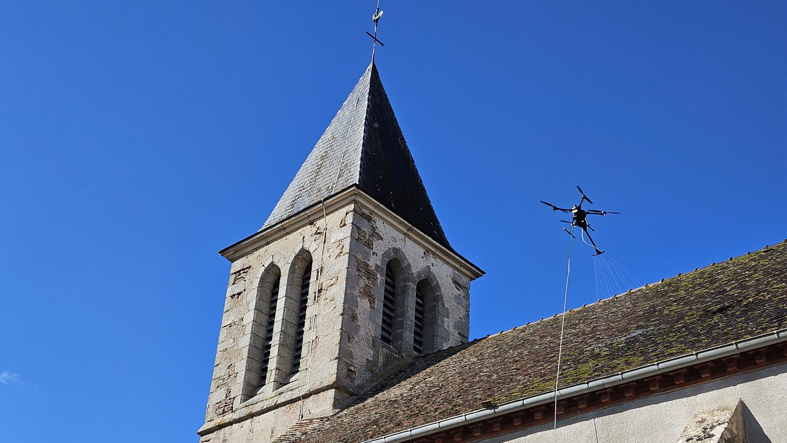 Nous réalisons un démoussage complet, sans monter sur le toit, pour éviter toute dégradation.